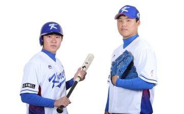 '아시아 프로야구 챔피언십 2017'에 출전하는 대한민국 국가대표팀 안익훈 선수(왼쪽)와 김대현 선수(오른쪽)가 'LG 올레드 TV'가 새겨진 유니폼을 입고 포즈를 취하고 있다.